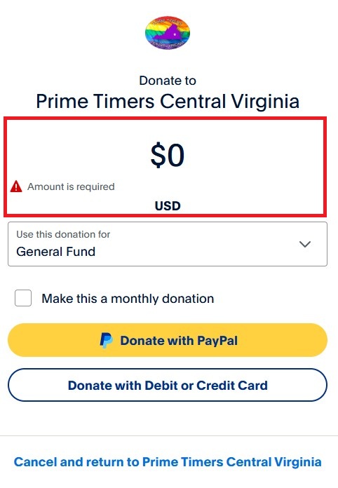 We are an all-volunteer member organization, and we depend in part on donations from generous supporters and members to allow us to continue to operate and provide support and services to our members and lesbian, gay, bisexual, and transgender people in central Virginia. Any amount is appreciated. Prime Timers Central Virginia, Inc. is a 501(c)(7) tax-exempt non-profit organization and donations may not be tax deductible.