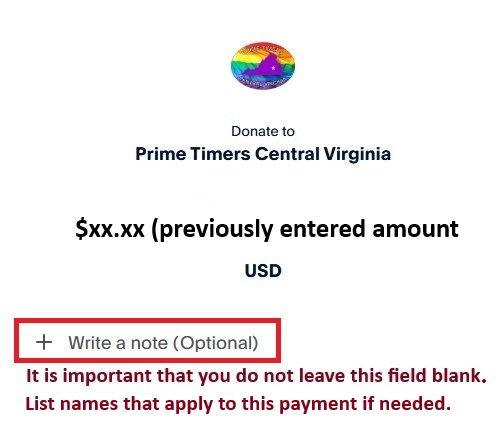 (Note: PayPal has stopped accepting credit cards and we are working to resolve the issue. However, you can pay online if you have a PayPal account. We apologize for inconvenience. Checks made out to Prime Timers of Central Virginia can be given to a current or former Board Member at any of our public events.)